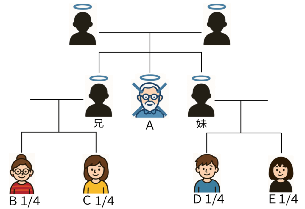 被相続人Aに子も孫もおらず、父母・祖父母も既に亡くなっており、兄弟姉妹も先に亡くなっている場合、被相続人Aの甥・姪 BCDEが相続人となります。