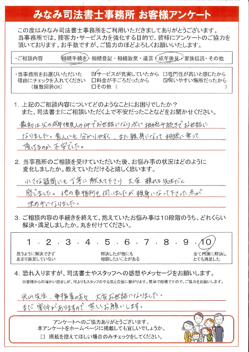 最初は父の成年後見人の件でお世話になり、次に相続手続きでお世話になりました。素人にもわかりやすく、また親身になって相談に乗っていただけるかが不安でした。